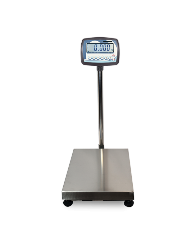 Plataforma de estructura tubular en acero pintado, con plato en acero inoxidable y columna en acero inoxidable.