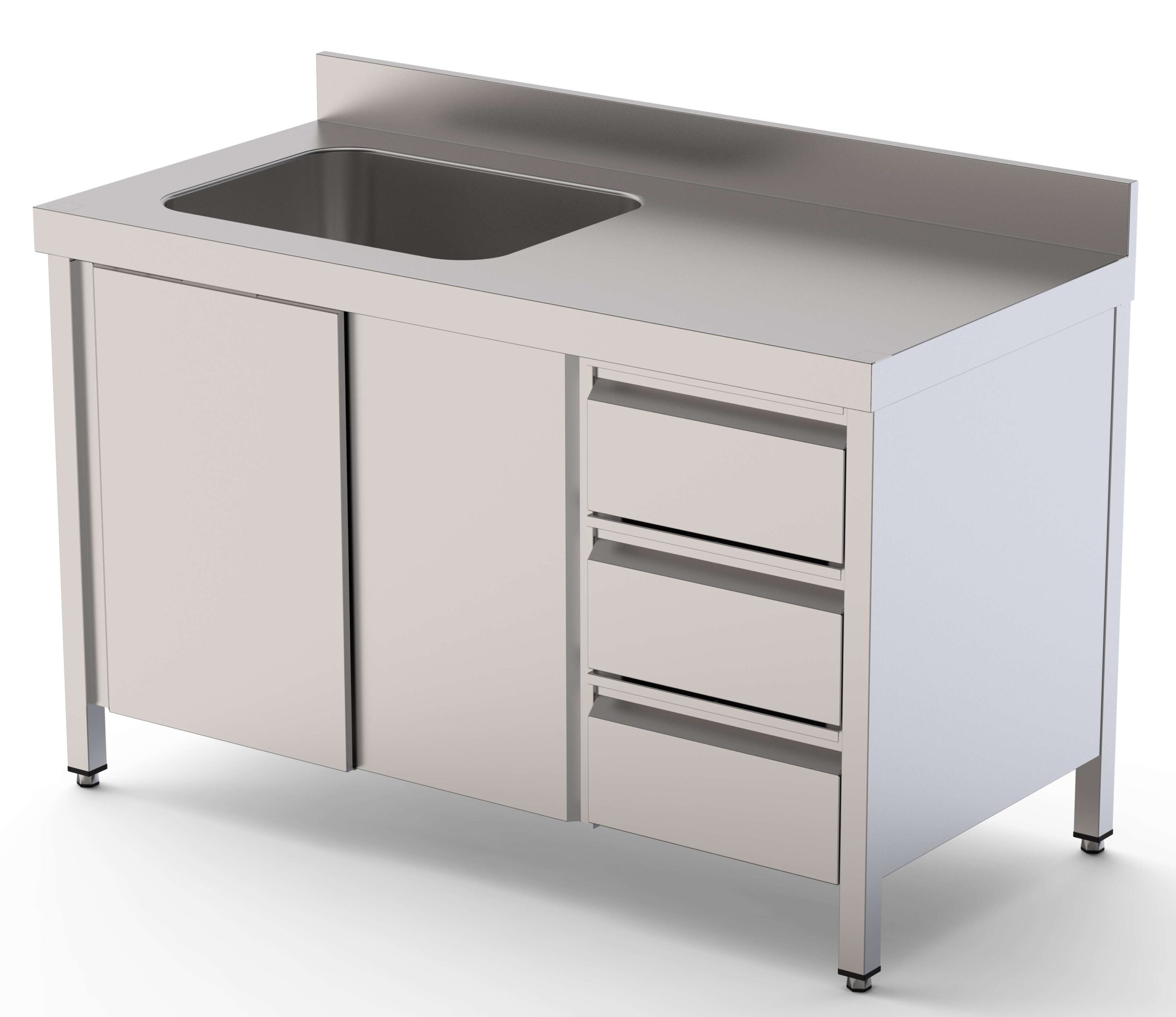 Mesa de Trabajo Acero Inoxidable Mural Con Puertas y Con Cubeta a la Derecha y Cajones 2200x700x850h mm WTW17022RBSDDL